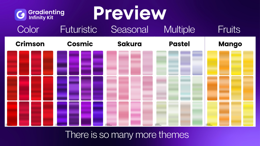 524 Professionally Crafted Gradient Themes. The largest gradient collection available, with 524 unique themes across 11 distinct categories